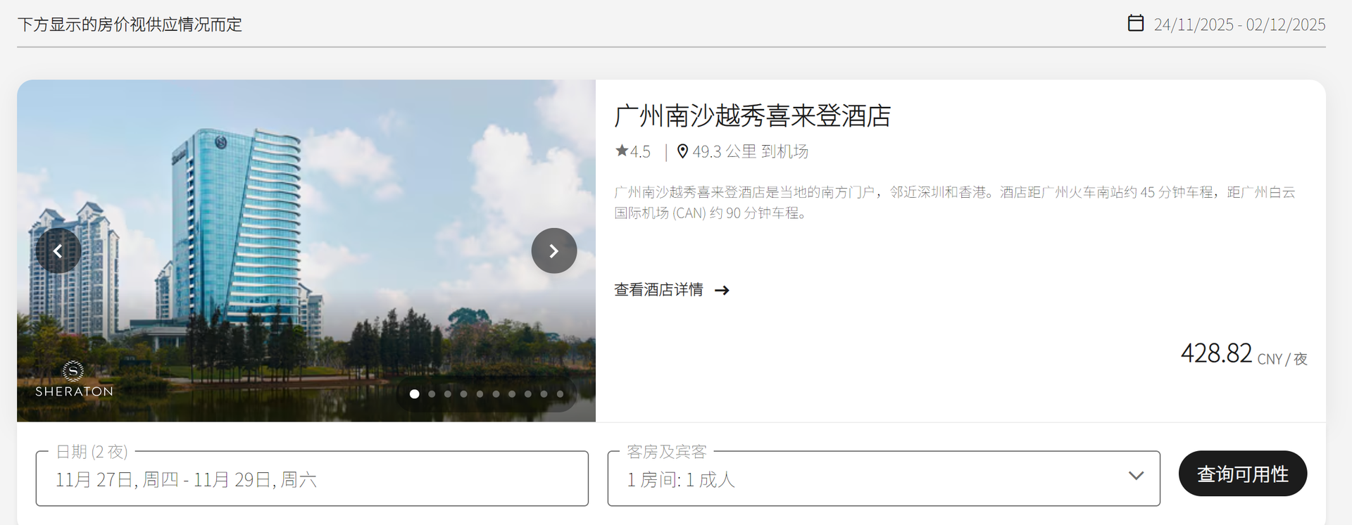 点击进入喜來登酒店会议专属链接后,选择会议入住日期(开始日期:11月27)、离开日期(结束日期:11月29日)以及选择房间数量,点击“查询”按钮