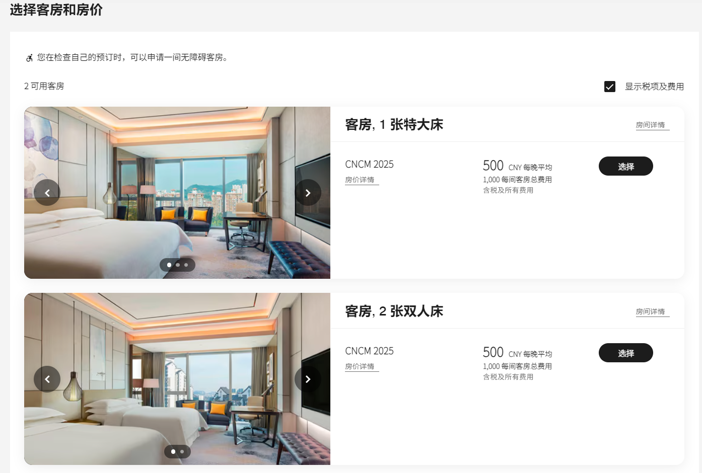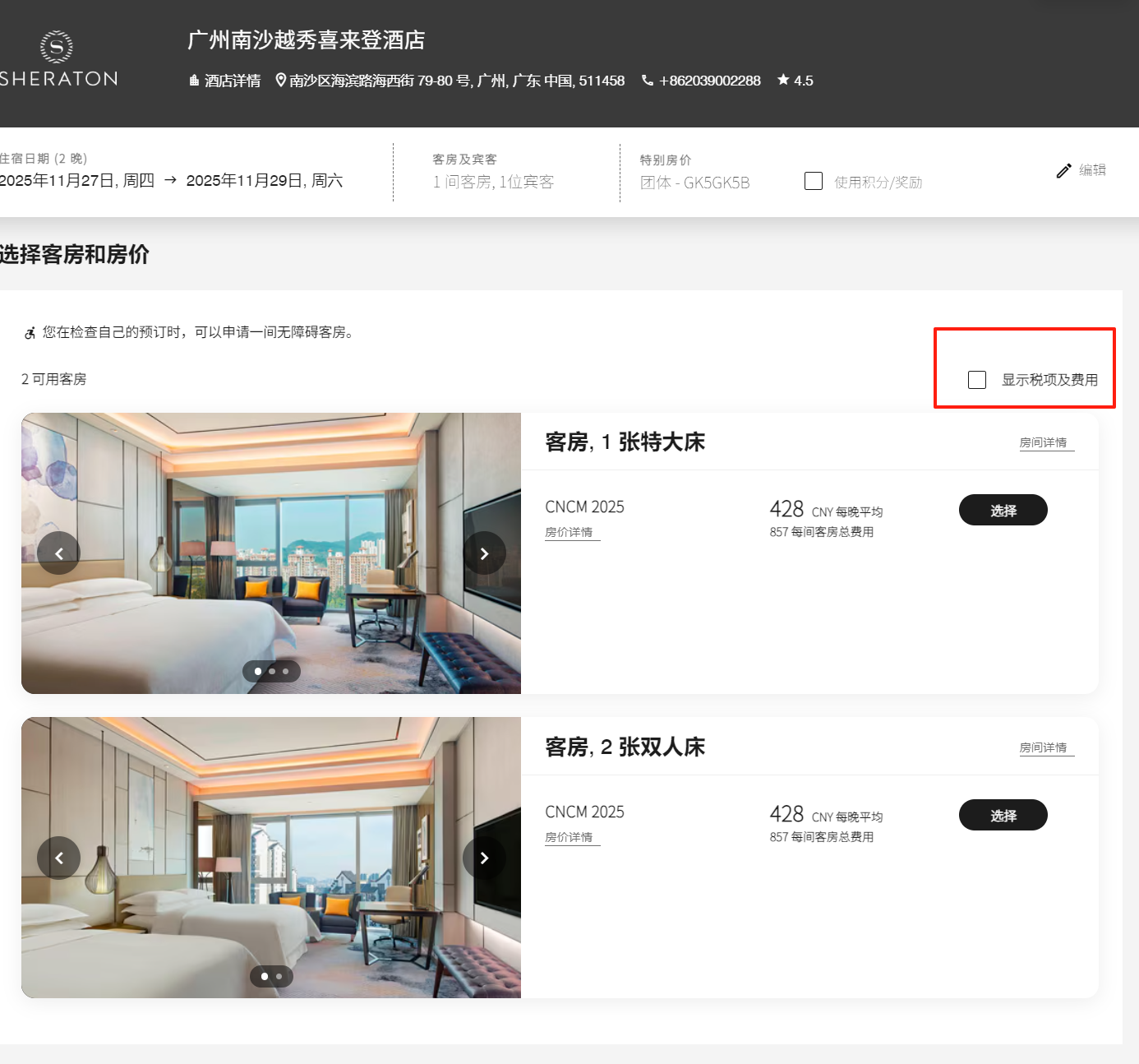 选择您所需要的房间类型(大床房或双床房),428元价格为不含税价格,点击“显示税项及费用”后,每晚价格为500元。